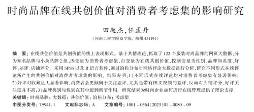 文章基于共情理论,运用网络爬虫抓取了122个服装时尚品牌的网页大数据,采用SPSS以及R语言软件,通过泊松分布对网络评论大数据进行分析,研究不同形式在线评论所产生的共创价值对消费者考虑集的影响,是目前关于线上消费行为的前沿研究。